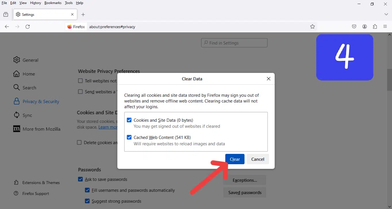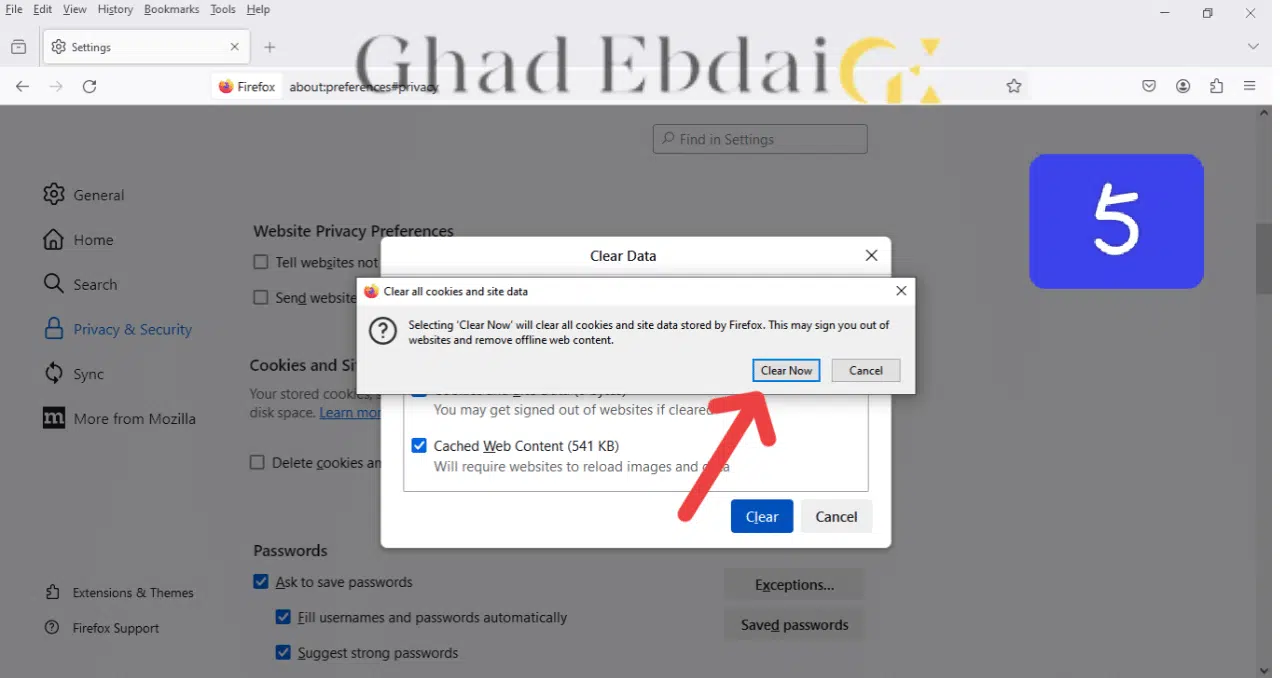 - وبذلك تم حذف جميع ملفات الكوكيز وبيانات المواقع في متصفح فايرفوكس