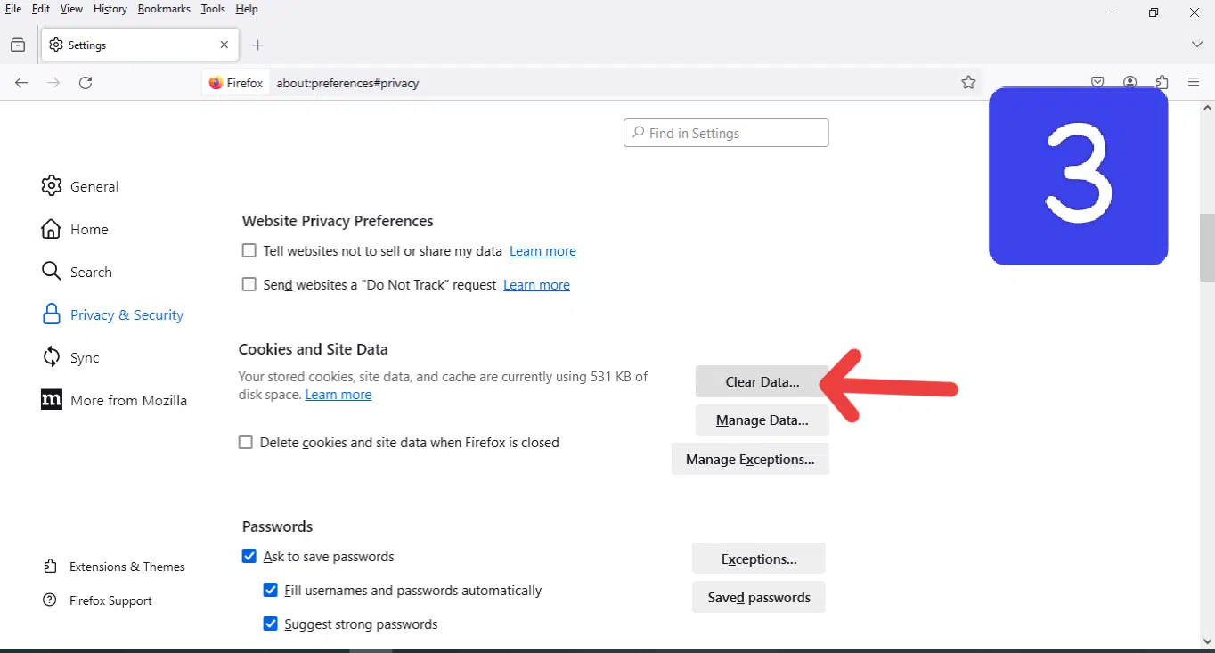 - ثم مرر الصفحة إلى الأسفل، وفي قسم “Cookies and Site Data” قم بالضغط على “Clear Data”.